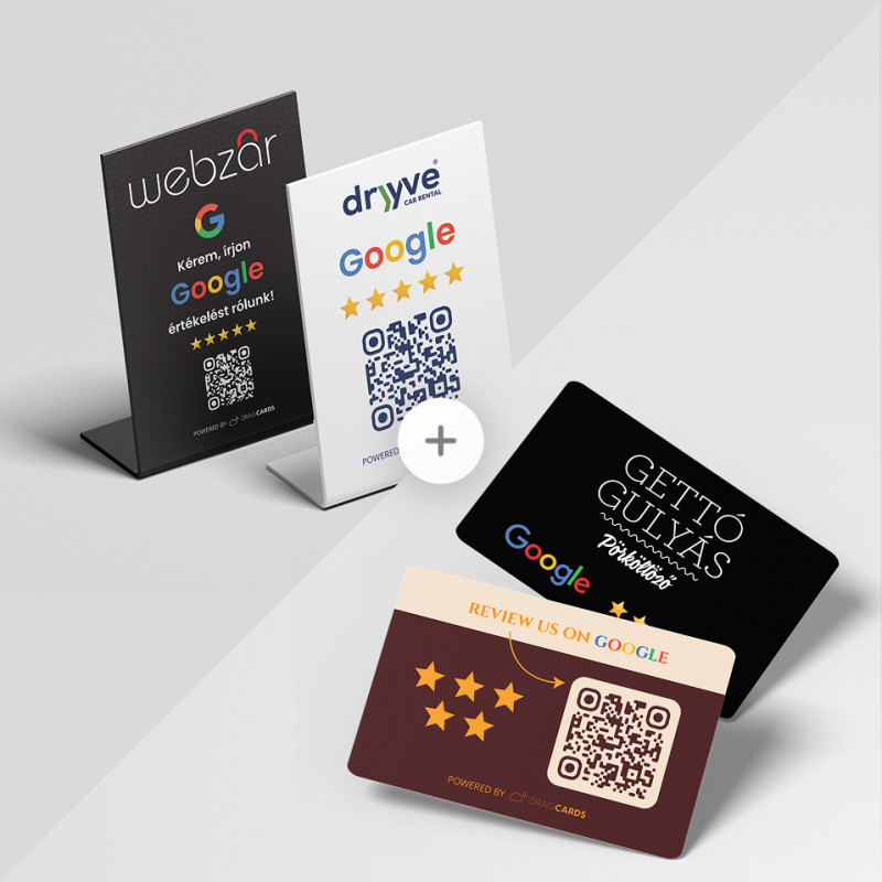 A csomag részeként a tábla és a kártya QR-kóddal és NFC-vel azonnal az értékelési oldaladra irányítja az ügyfeleket, applikáció nélkül.