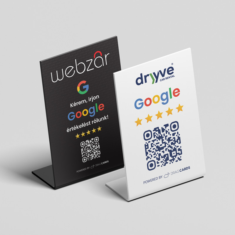 Az értékelő tábla QR-kóddal és NFC-vel azonnal a Google értékelési oldaladra irányítja a vásárlókat, applikáció nélkül.