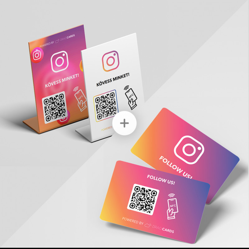 A csomag részeként a tábla és a kártya QR-kóddal és NFC-vel azonnal az Instagram profilodra irányítja az ügyfeleket, applikáció nélkül.