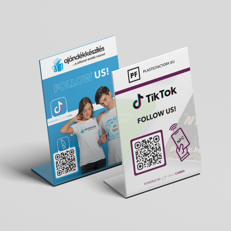 A tábla QR-kóddal és NFC-vel azonnal a TikTok oldaladra irányítja az érdeklődőket, applikáció nélkül.