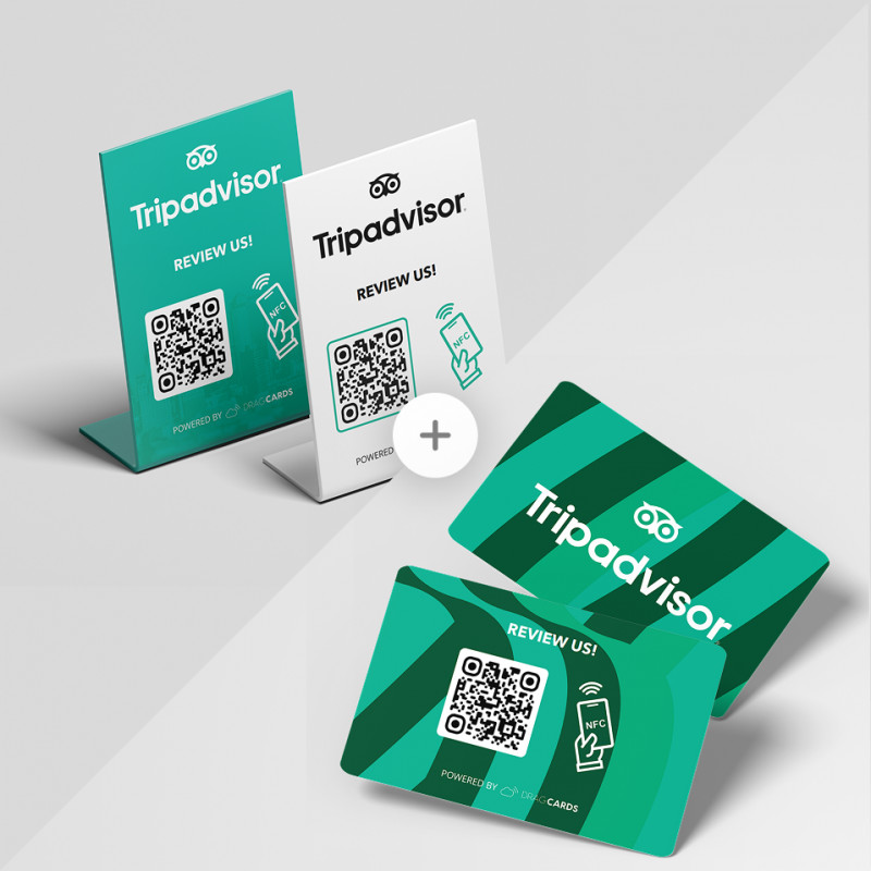 A csomag részeként a tábla és a kártya QR-kóddal és NFC-vel azonnal a Tripadvisor értékelési oldaladra irányítja a vendégeket, applikáció nélkül.