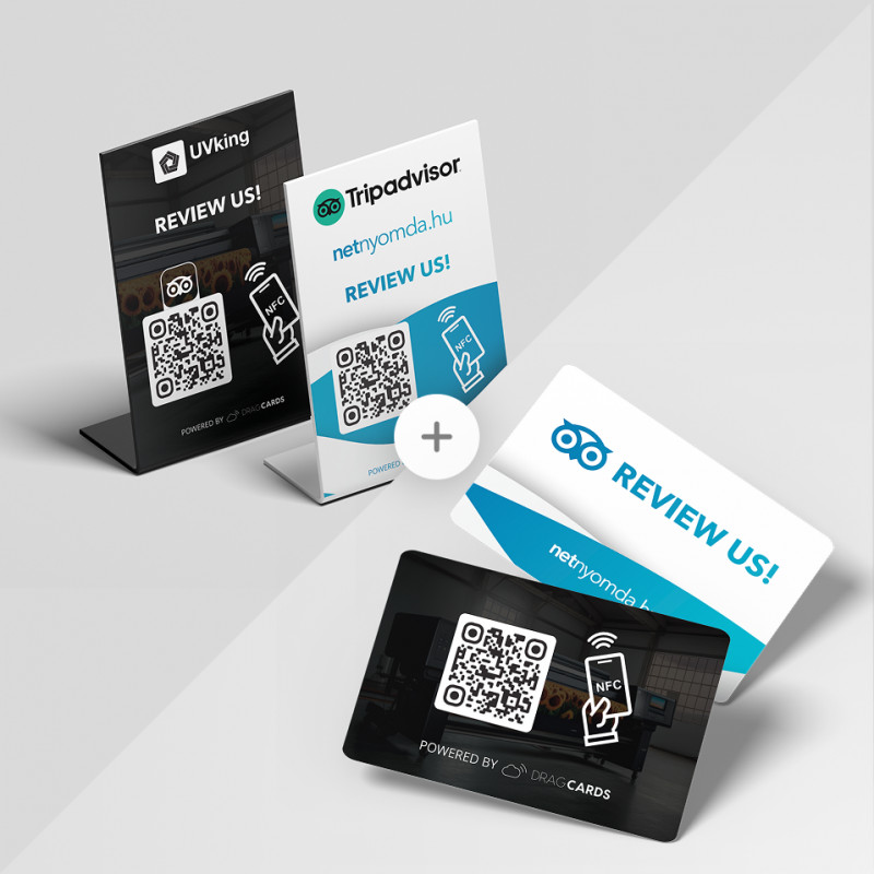 A csomag részeként a tábla és a kártya QR-kóddal és NFC-vel azonnal a Tripadvisor értékelési oldaladra irányítja a vendégeket, applikáció nélkül.